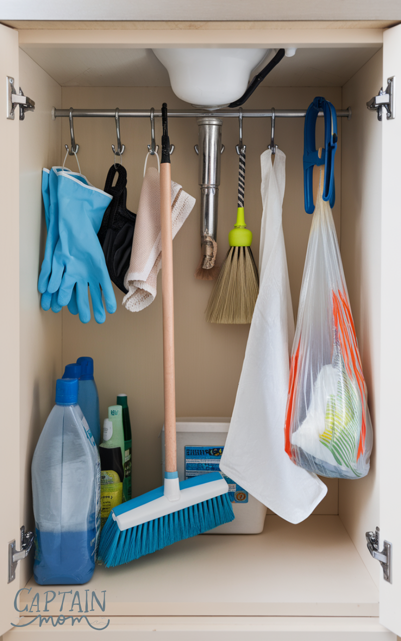 The inside of cabinet doors is often unused space. Adding hooks is one of the most simple under sink kitchen storage ideas for hanging gloves, brushes, or reusable bags without taking up shelf space.