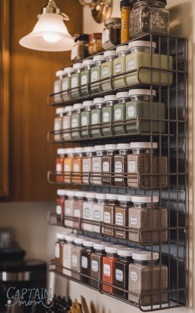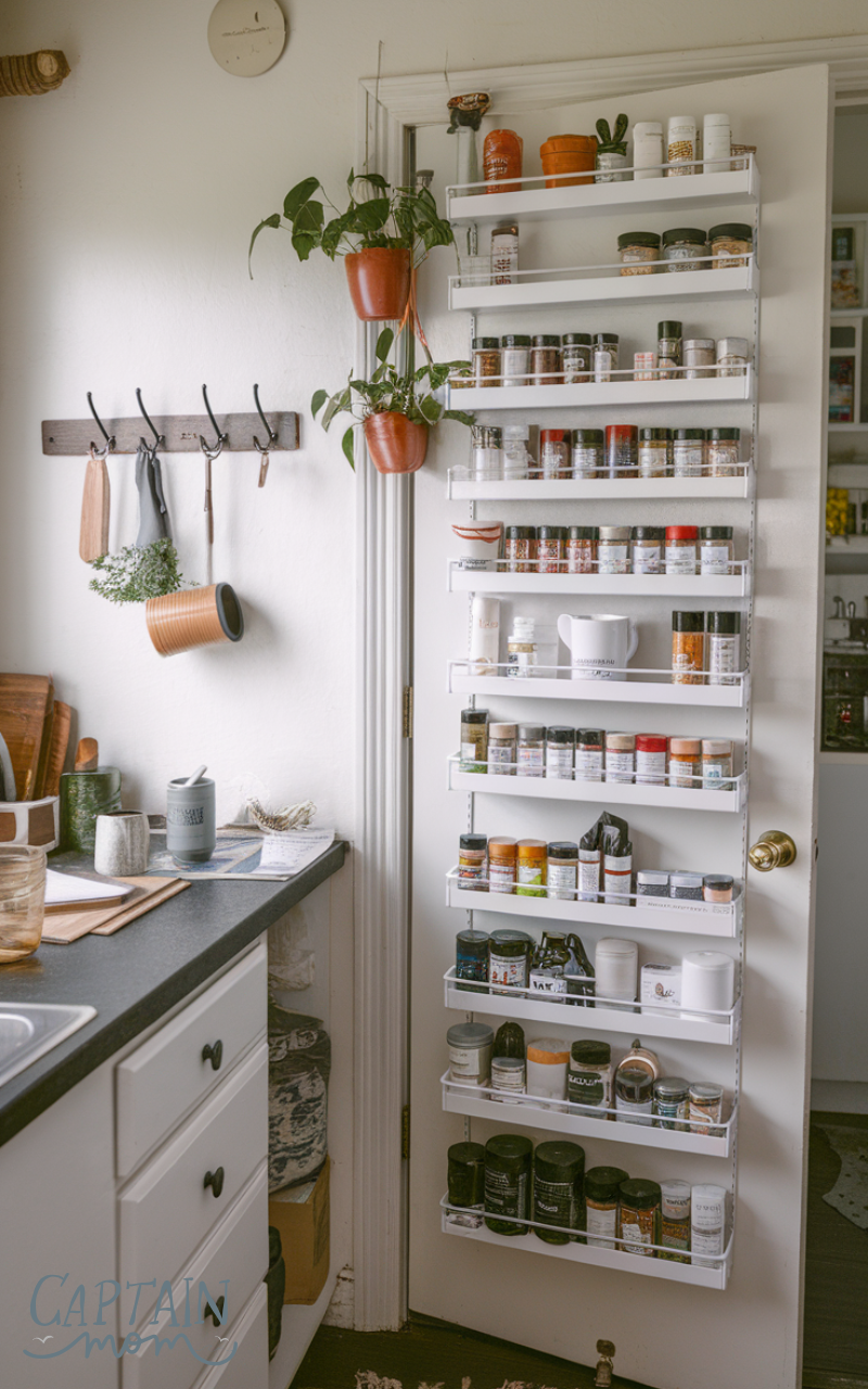 Over-the-door racks are perfect if counter and cabinet space is limited but you still want efficient spice rack organization. I hang them on pantry or cabinet doors, which instantly frees up shelves while keeping spices neatly arranged. I like choosing adjustable racks so jars fit snugly, and arranging them by type or size adds extra order. These racks are easy to install and move, and they make even the smallest kitchen feel much more spacious and functional, turning hidden corners into practical storage zones.