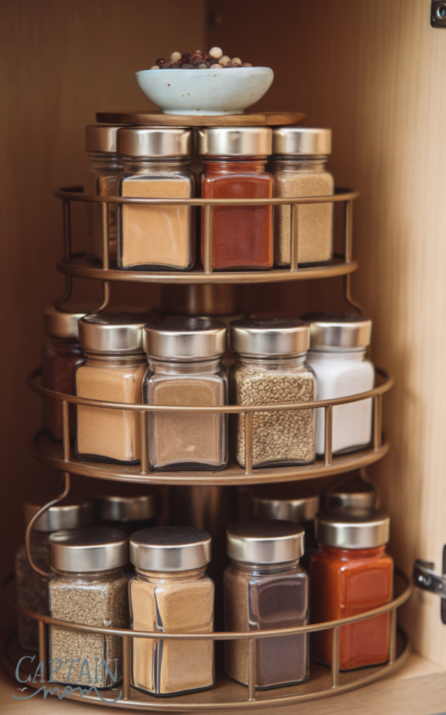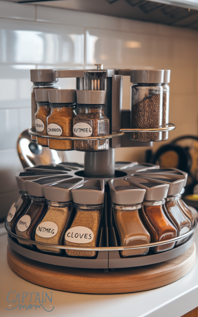 Rotating spice carousels make spice rack organization fun and efficient. I spin the carousel to access any jar in seconds, which is perfect for keeping commonly used spices within reach. It saves counter space and adds a touch of elegance to my kitchen setup. Carousels are especially handy when I have a wide variety of spices, making it easy to see everything at once. They combine convenience with style, giving my kitchen a professional feel while keeping all my essential spices perfectly organized.