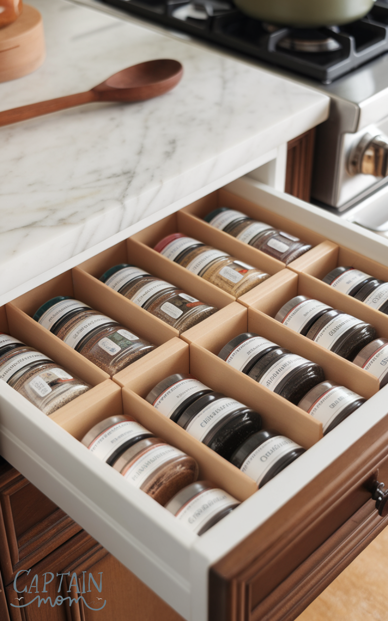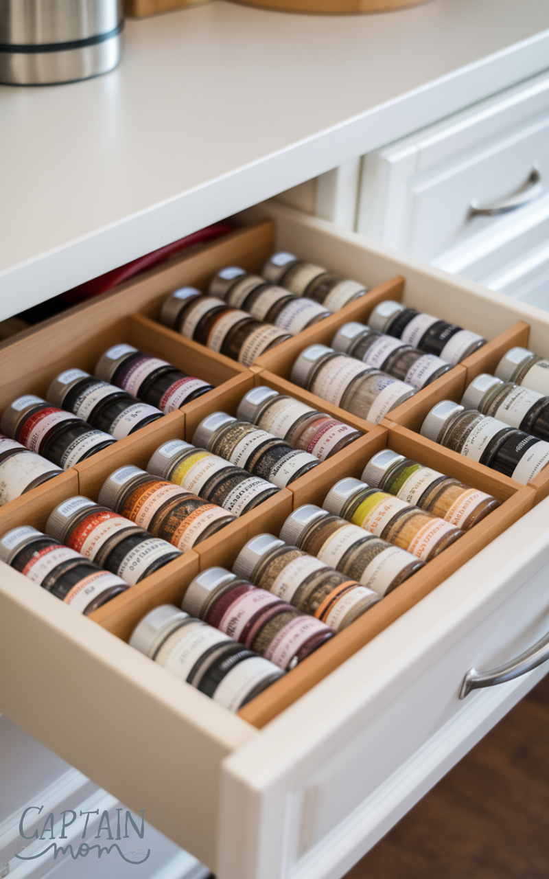 Drawer dividers are perfect for improving spice rack organization, especially in kitchens with limited counter space. I place dividers inside drawers to create small compartments, keeping each spice jar upright and easy to grab. This prevents jars from tipping over or getting mixed up, and I love how it keeps everything visible and neatly arranged. Drawer dividers also make cleaning simpler because each section stays contained, so spills don’t spread. It’s a small adjustment with a big payoff in maintaining a tidy, functional kitchen.