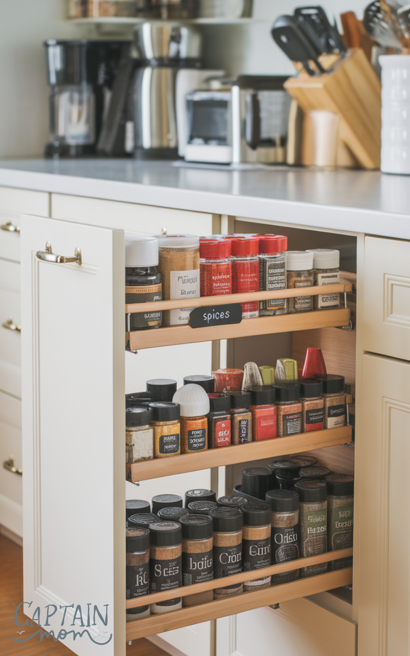 Pull-out drawers make spice rack organization effortless for me, especially in busy kitchens. These organizers allow all your spices to slide out for easy access, and I can arrange them alphabetically or by cuisine type. I love how each jar is visible at a glance, reducing the chance of forgetting or overbuying spices. Installing a drawer organizer can be a little investment, but it pays off in convenience and efficiency, making cooking less stressful and more fun. It also keeps my countertop clutter-free, which I appreciate every day.