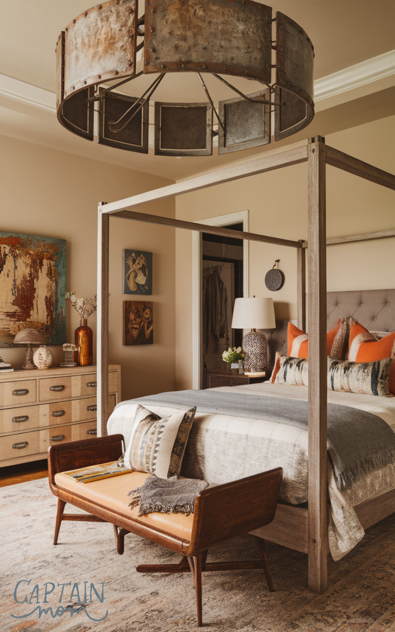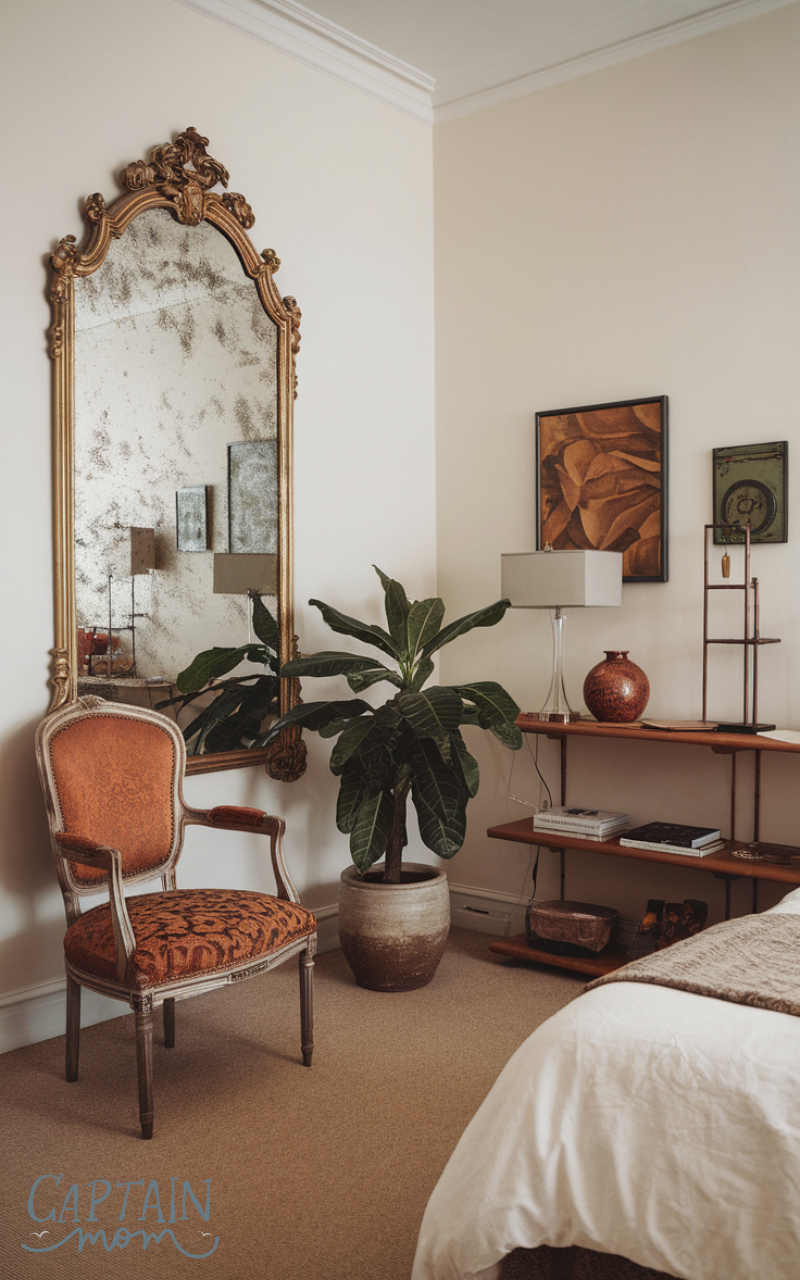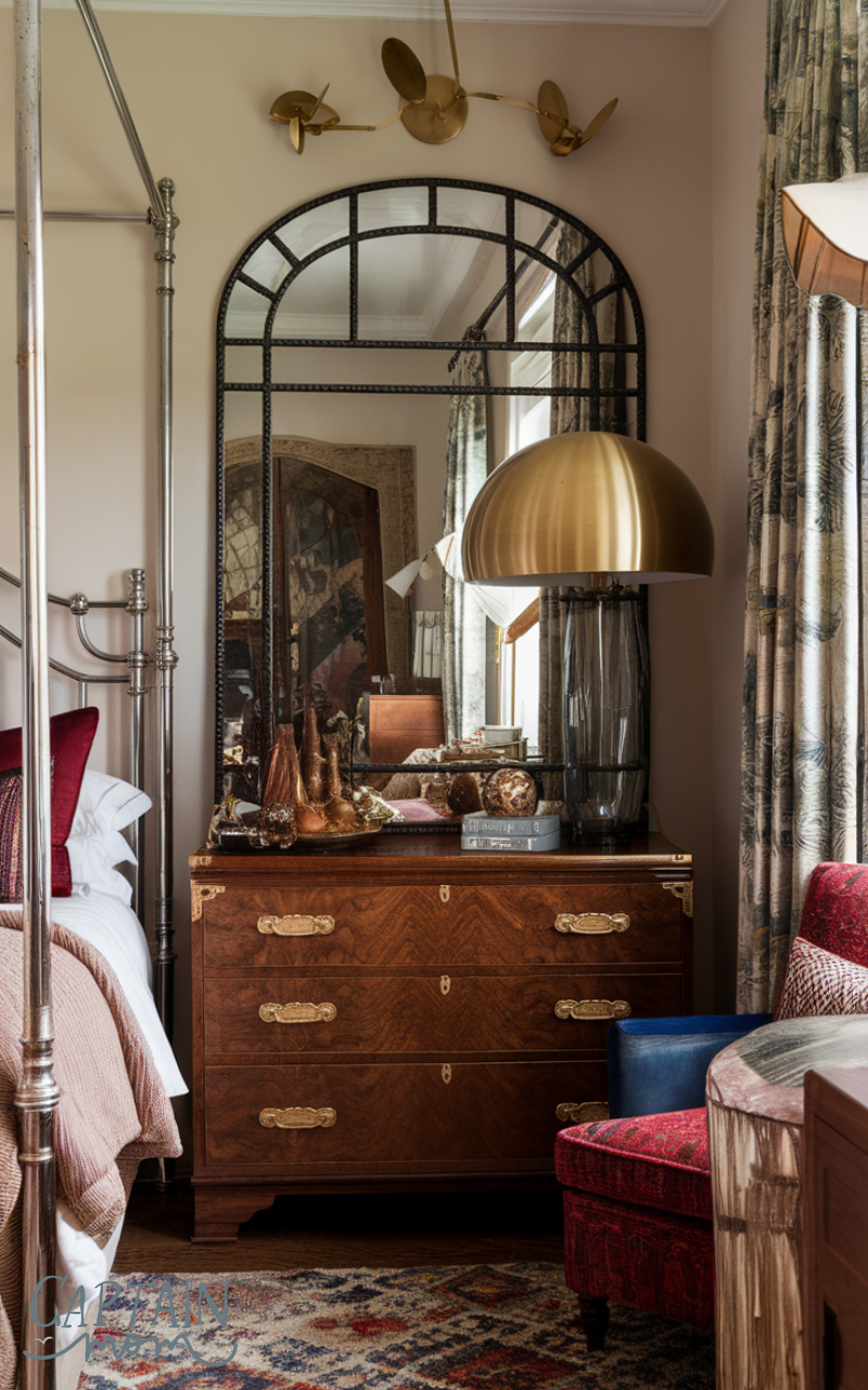 Eclectic bedroom ideas work beautifully when metals are mixed instead of matched. Combine brass, black metal, chrome, or gold accents in lamps, mirrors, and hardware. This creates visual contrast and adds a collected, lived-in feel.