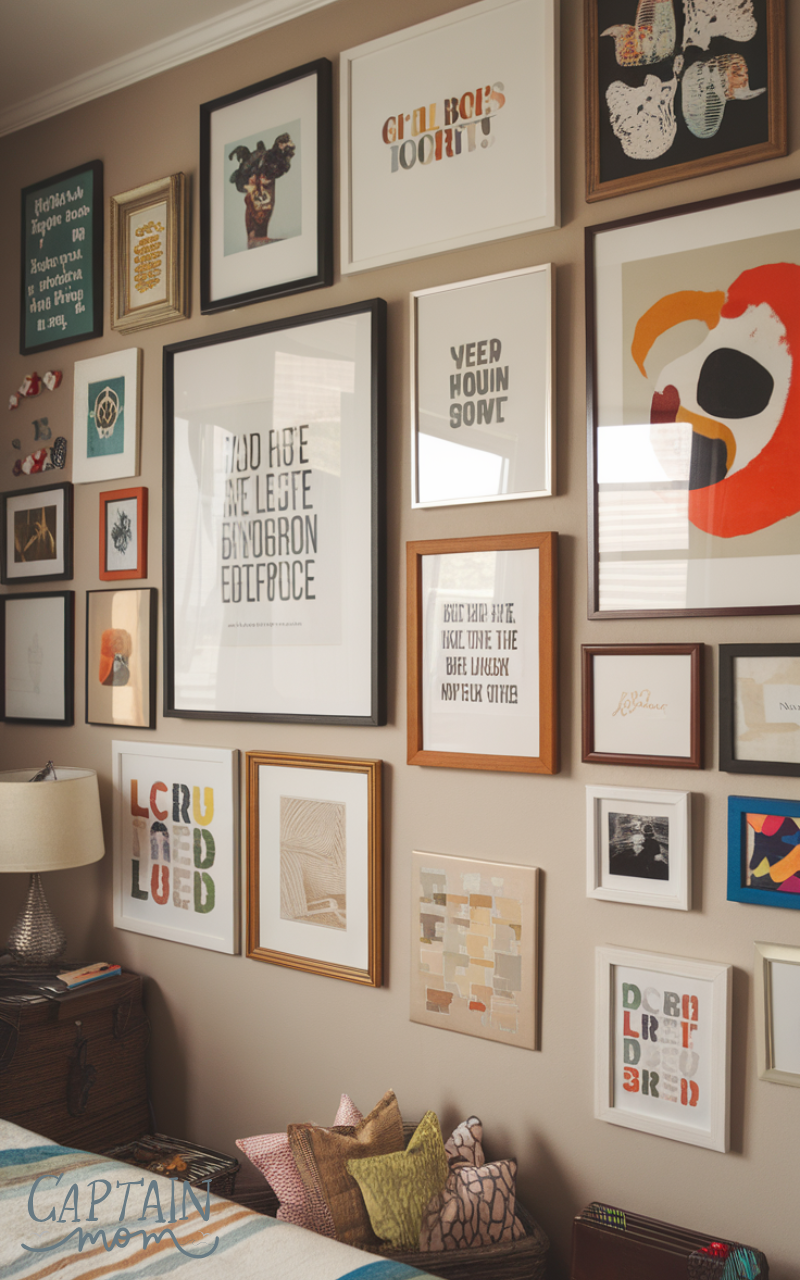 A gallery wall is perfect for eclectic bedroom ideas because it allows you to mix art styles, frame sizes, and personal photos. Combine illustrations, photography, quotes, and abstract art. This adds visual interest and tells your story in a creative and expressive way.