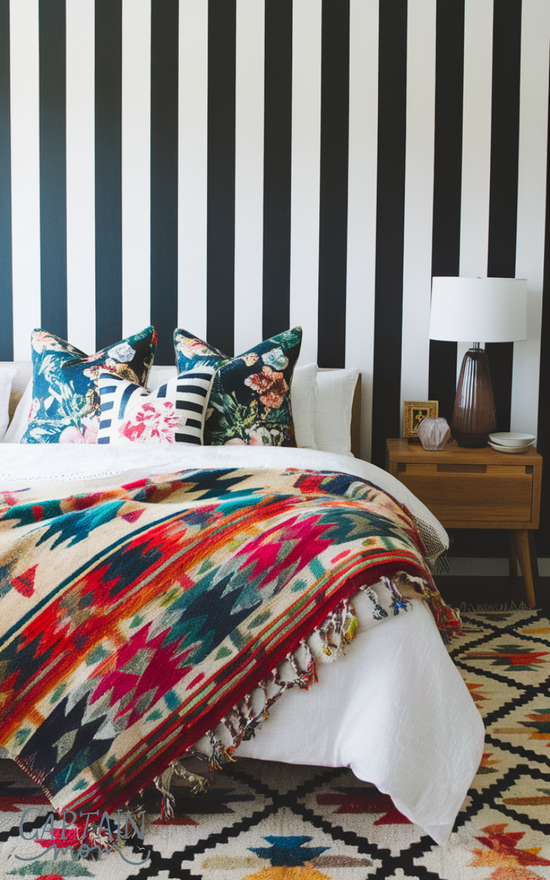Pattern mixing is at the heart of eclectic bedrooms. Combine stripes, florals, geometrics, or tribal prints on bedding, rugs, and curtains. The secret is to repeat at least one color across the patterns, which makes the room feel lively yet harmonious instead of chaotic. Layering patterns doesn’t stop at textiles—you can mix patterned wallpaper, throw pillows, and even patterned lampshades for a rich, layered look.
