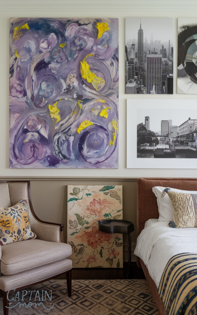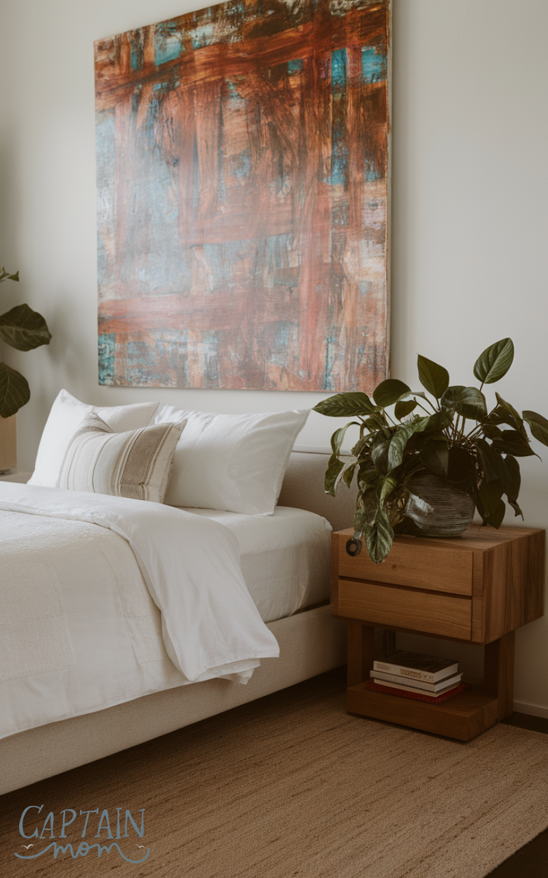 Instead of sticking to one art style, eclectic bedroom ideas encourage mixing abstract art with portraits, photography, and handmade pieces. This variety adds depth and keeps the walls visually engaging without feeling repetitive.