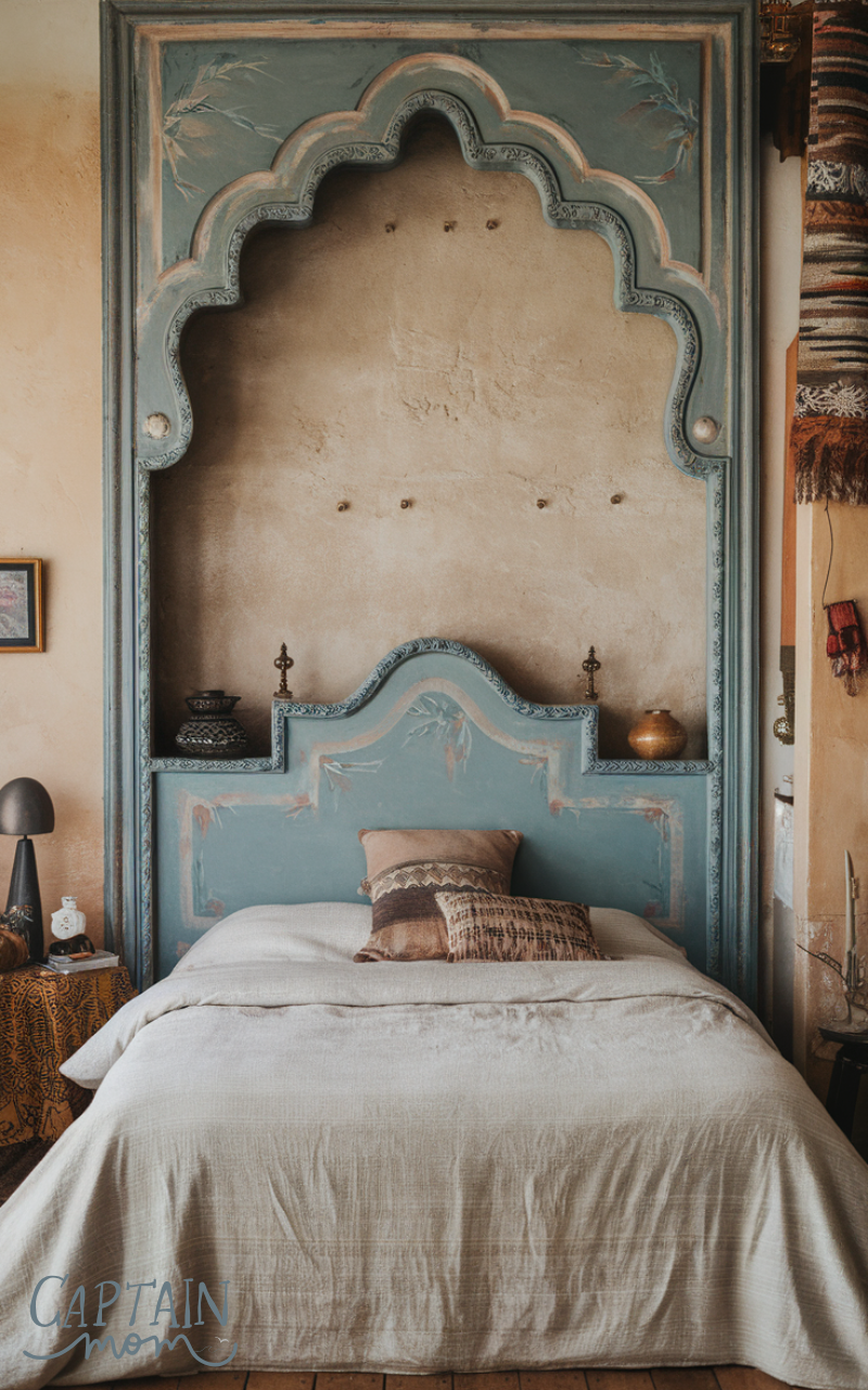 An eclectic bedroom doesn’t need a traditional headboard. Try an upholstered panel, a carved wood piece, a painted arch, or even hanging textiles. This creative choice adds uniqueness and becomes a standout feature in the room.