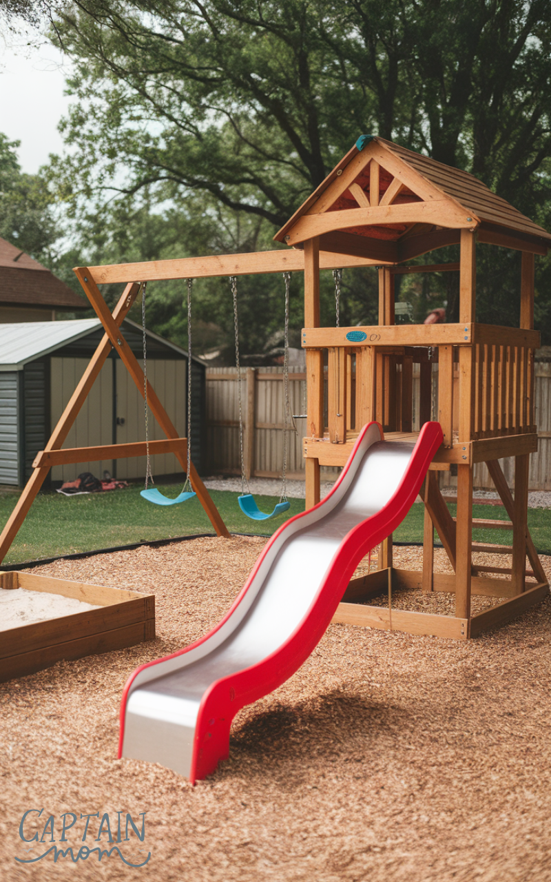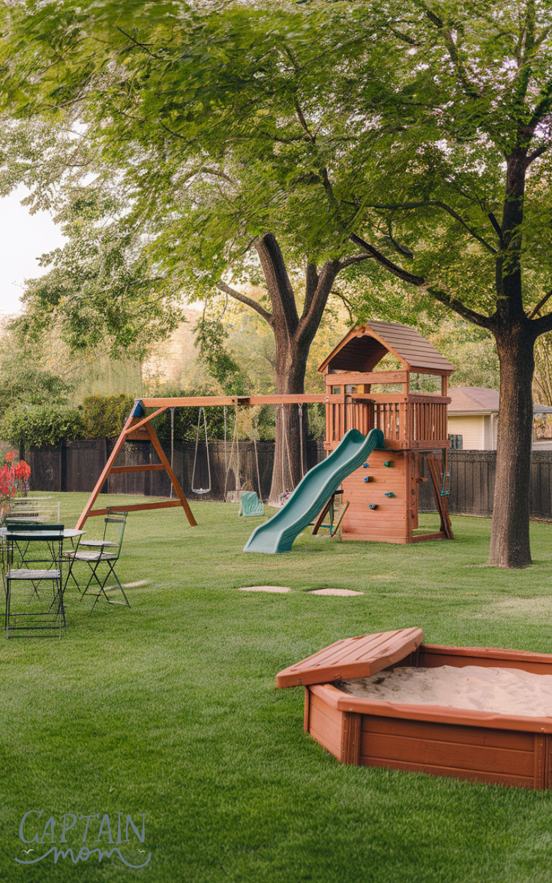 A swing and slide set is a classic choice. These family spaces using family backyard ideas with kids support active play and physical growth. Kids enjoy hours of movement and laughter. Parents appreciate safe, familiar equipment. Modern designs fit small or large backyards easily. This timeless setup keeps children happy and engaged outdoors.