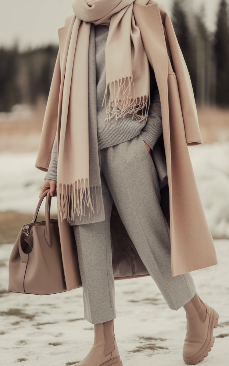 Finally, full monochrome outfits in neutral tones topped with statement accessories are a top Pinterest favorite using aesthetic winter outfits for women. Think beige or gray layers with bold boots, bags, or scarves. This creates a minimalist yet stylish vibe that’s modern, chic, and perfect for any winter day.