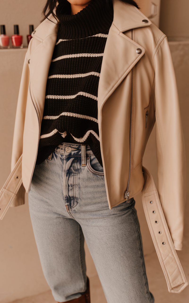 Pairing a leather jacket with a warm knit is an edgy yet cozy Pinterest favorite, using aesthetic winter outfits for women. This mix of textures balances toughness and softness, perfect for casual outings or coffee runs. Add jeans and boots to complete the aesthetic effortlessly.