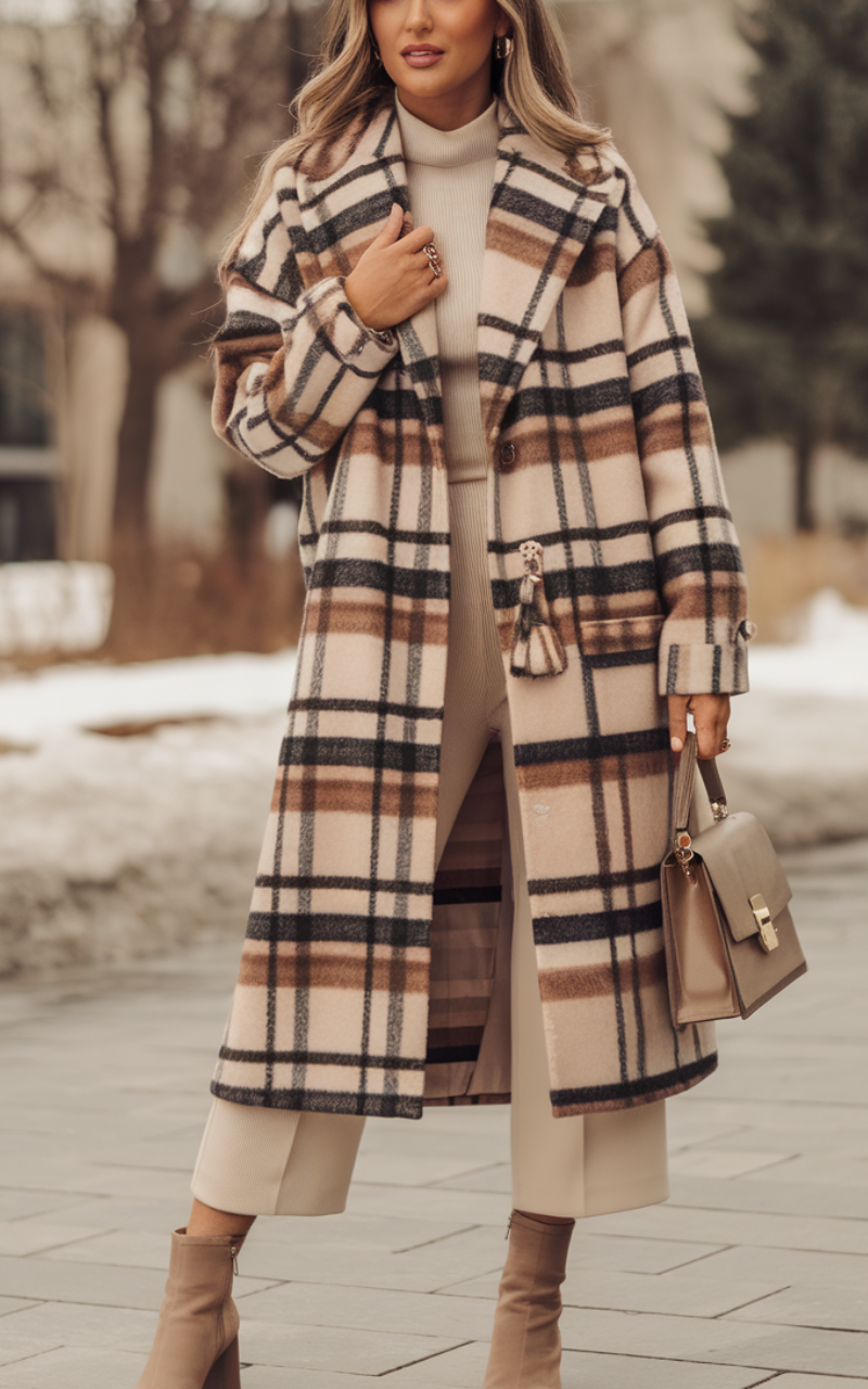 Plaid coats remain a top pick among Pinterest favorites using aesthetic winter outfits for women. Wearing them over a monochrome outfit—like black or beige separates—adds visual interest without clashing. Pair with simple ankle boots and a handbag for a polished, trendy winter look.