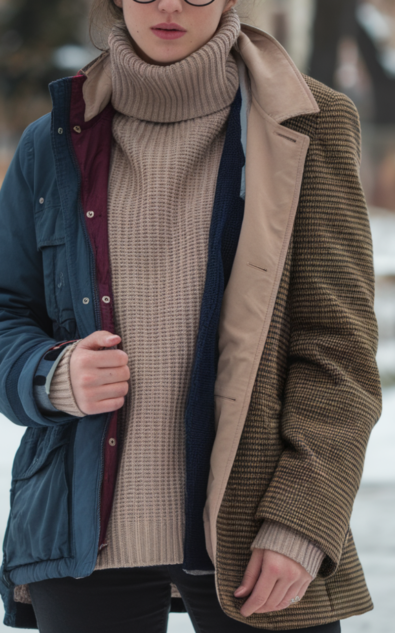 Layering multiple turtlenecks under jackets or blazers is a creative Pinterest favorite using aesthetic winter outfits for women. This adds warmth and a unique visual appeal, letting you mix textures and colors for a fun, fashionable look during cold months.