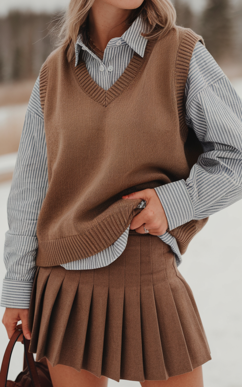 Sweater vests layered over button-up shirts are a trendy Pinterest favorite using aesthetic winter outfits for women. This look combines preppy vibes with cozy layers. Pair with pleated skirts or jeans for a versatile winter aesthetic that’s both cute and chic.