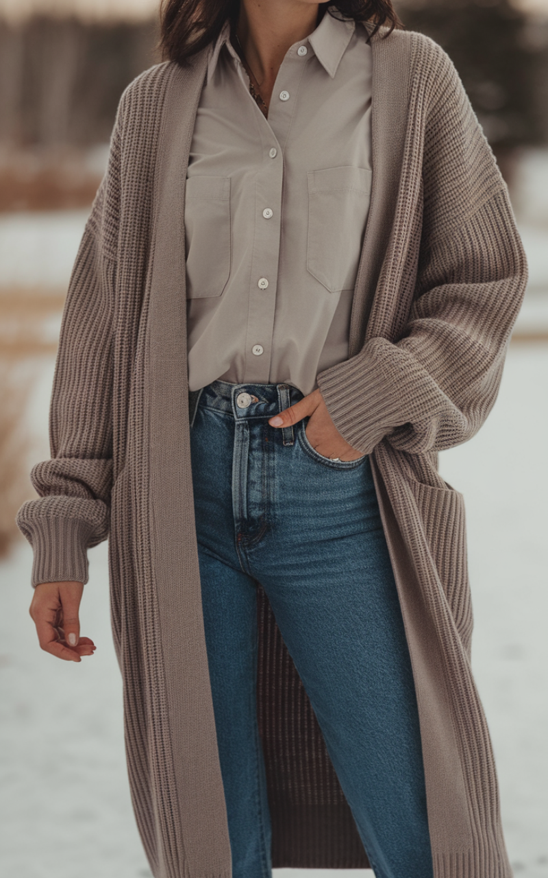 Layering a long cardigan over shirts or thin sweaters is a cozy Pinterest favorite using aesthetic winter outfits for women. This versatile style can be paired with jeans, skirts, or even leggings. Choose neutral colors for a minimalist vibe or bright shades for a fun winter look.