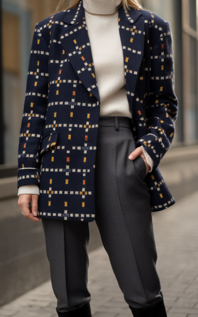 A wool blazer layered over a turtleneck is an elegant Pinterest favorite using aesthetic winter outfits for women. It works well for office days, dinners, or casual city walks. Pair with tailored trousers or a skirt and boots for a timeless, sophisticated winter outfit.
