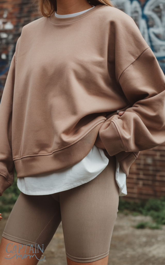 10. Sand-Colored Sweatshirt and Biker Shorts