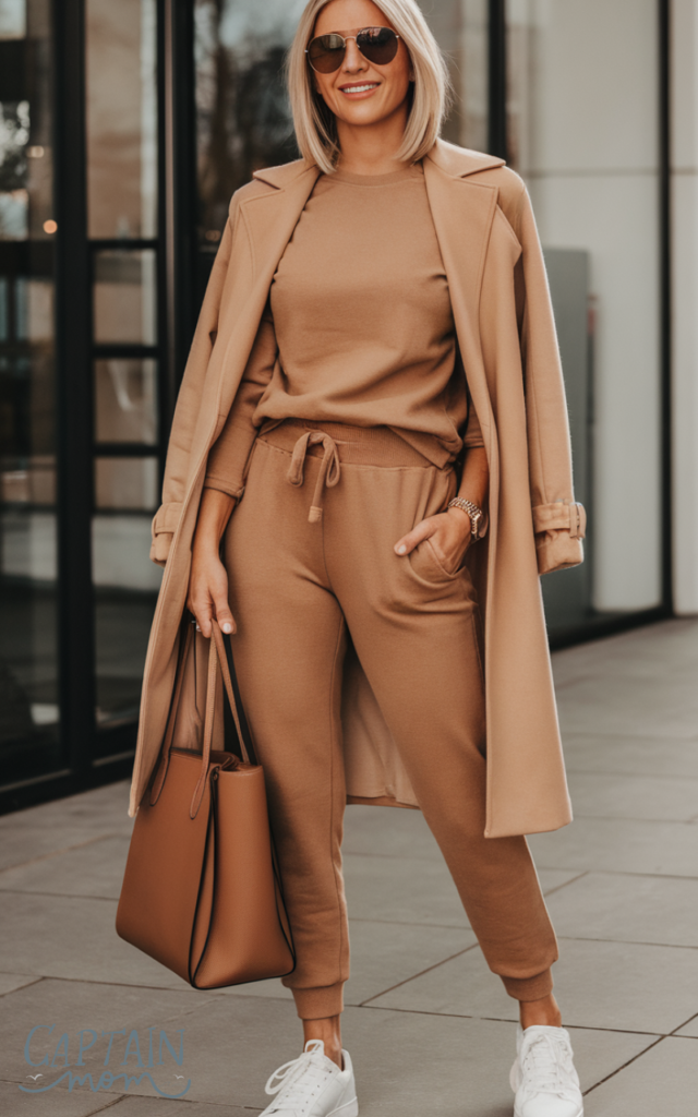A camel-colored sweat set with a relaxed fit brings warmth and sophistication to Pinterest saves using neutral lounge outfits for women. The rich tone looks luxurious while still being comfortable and practical for everyday wear. This set is perfect for autumn days, travel, or cozy indoor lounging. Pinterest saves using neutral lounge outfits for women often style this outfit with white sneakers, a beige trench coat, and a structured tote bag.