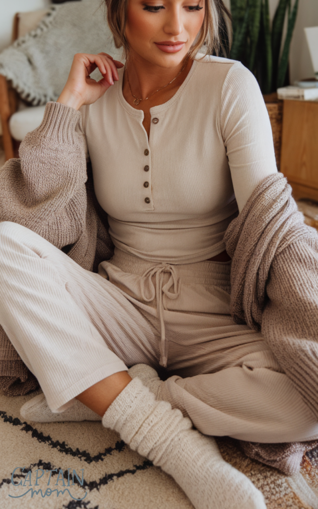 A vanilla-colored henley top paired with neutral lounge pants is simple but chic, and frequently appears in Pinterest saves using neutral lounge outfits for women. The button detail adds interest without being too busy, while the soft fabric keeps everything comfortable. This outfit works well for relaxed mornings, coffee dates, or light house chores. Pinterest saves using neutral lounge outfits for women usually pair this look with cozy socks, a loose cardigan, and natural makeup.